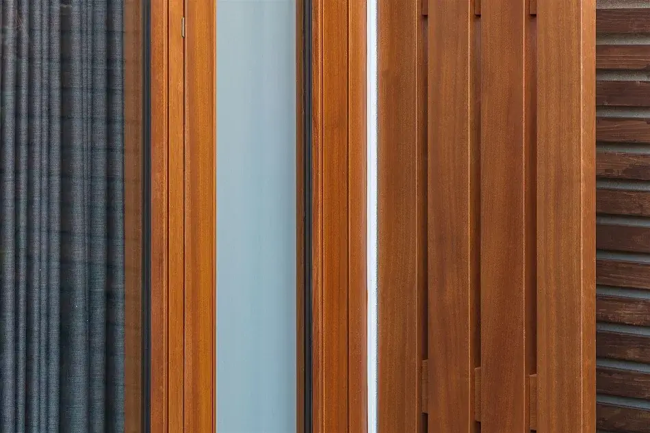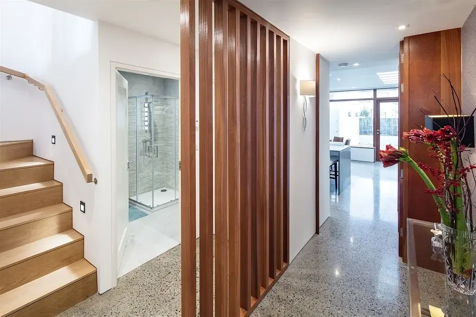 Two timber fin screens – their language referencing the structure of the Wooden Bridge – help define circulation & screen utilities.