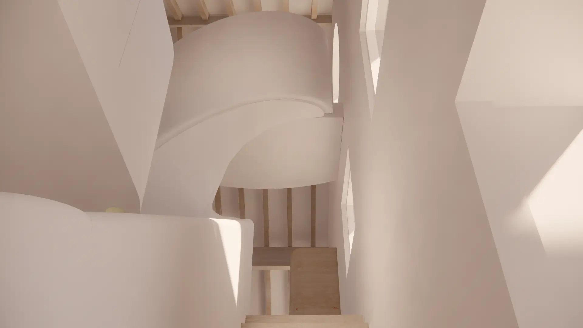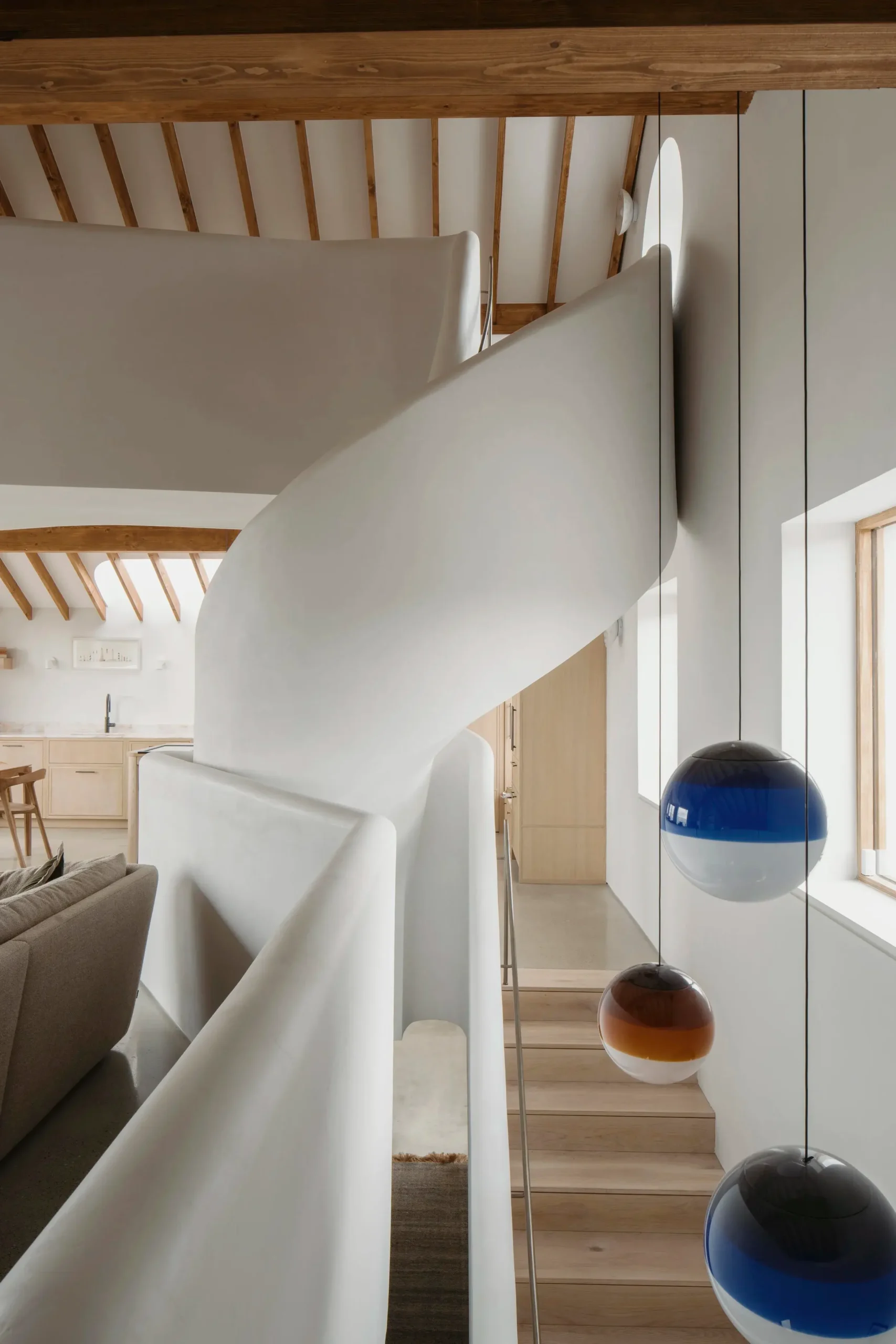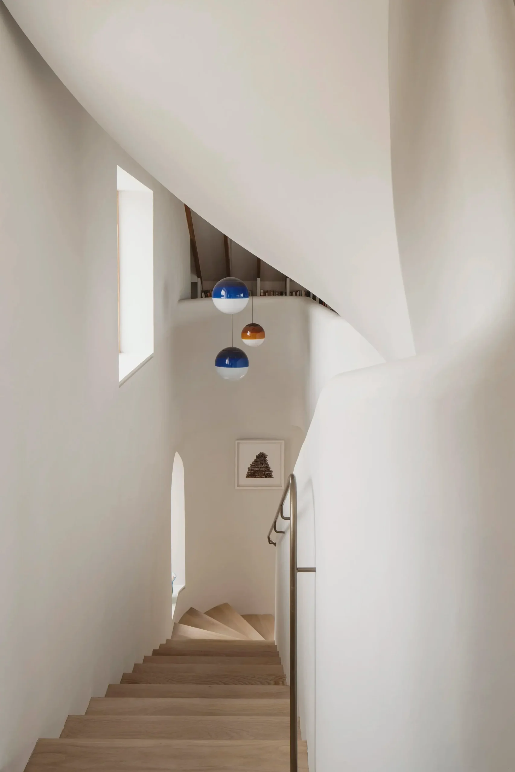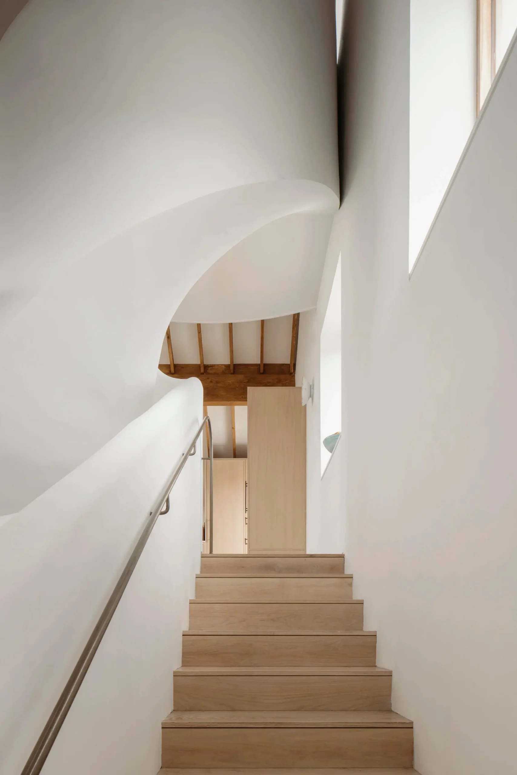 Vertical circulation is conceived as a ribbon which twirls up through the volume of the house and culminates in a small seating gallery just below the glulam apex and provides views through a circular opening towards the bay and mountains beyond.