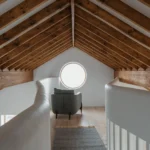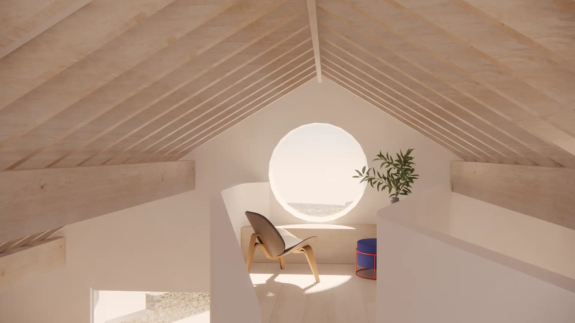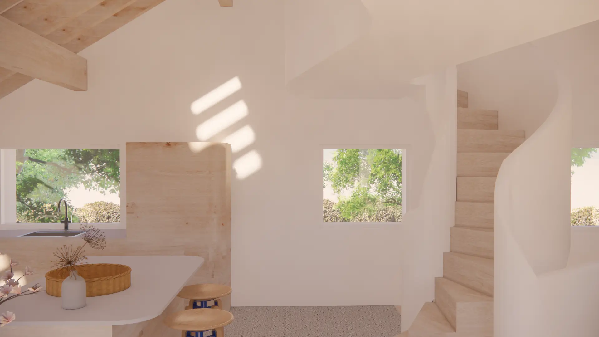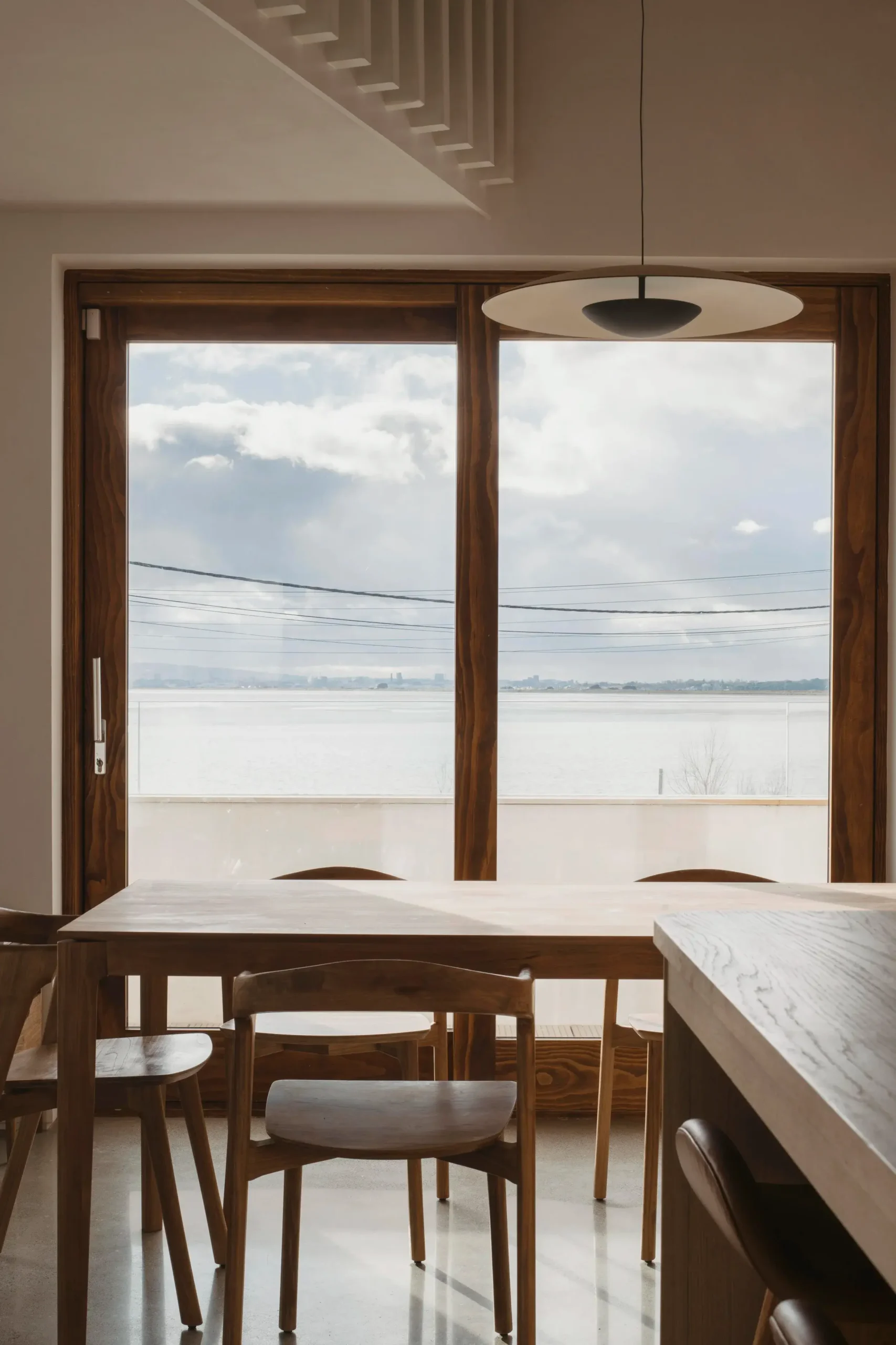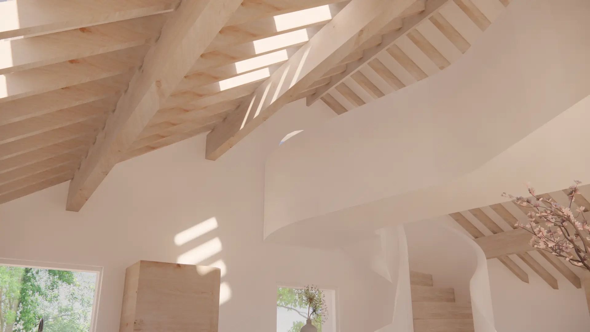 Vertical circulation is conceived as a ribbon which twirls up through the volume of the house and culminates in a small seating gallery just below the glulam apex and provides views through a circular opening towards the bay and mountains beyond.