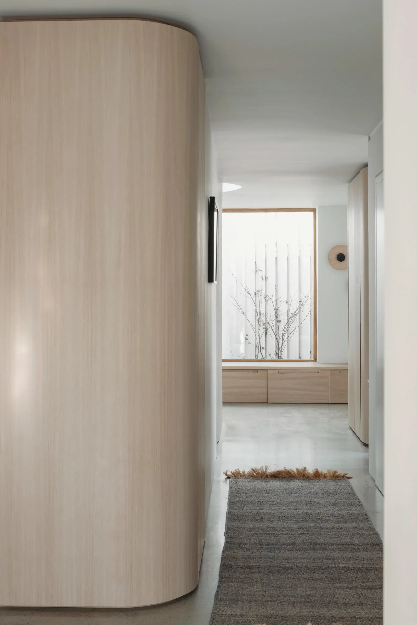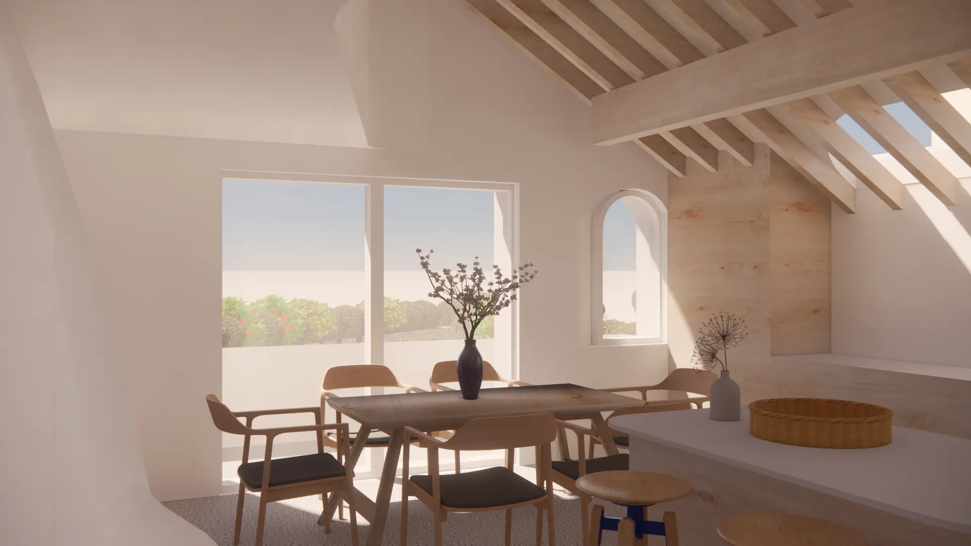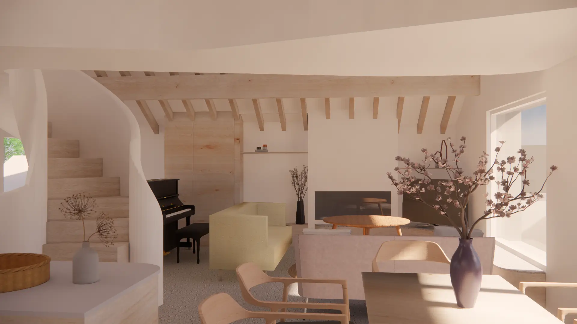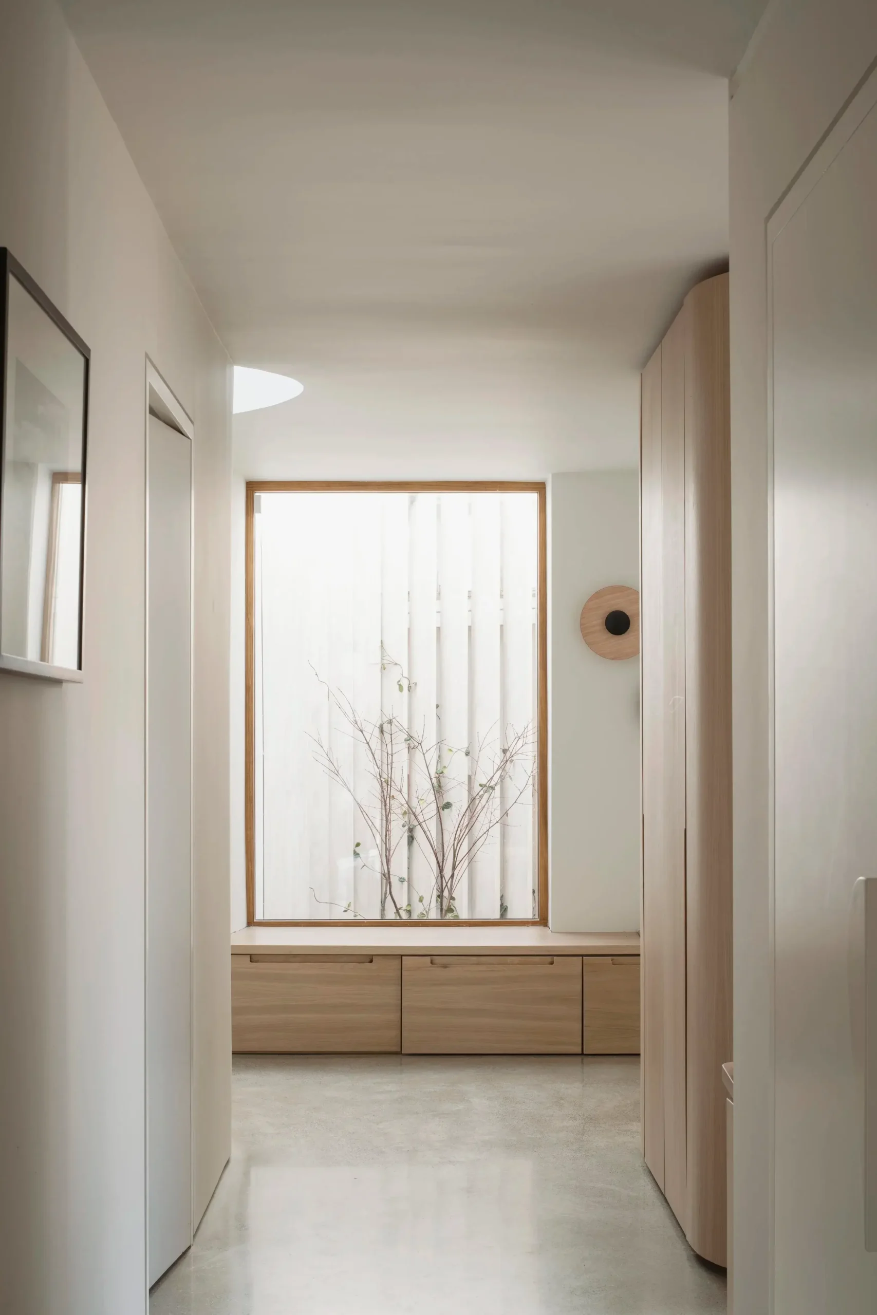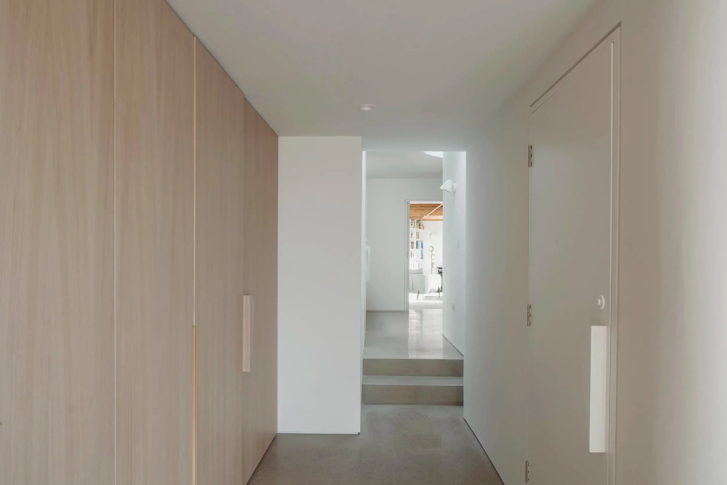 Vertical circulation is conceived as a ribbon which twirls up through the volume of the house and culminates in a small seating gallery just below the glulam apex and provides views through a circular opening towards the bay and mountains beyond.