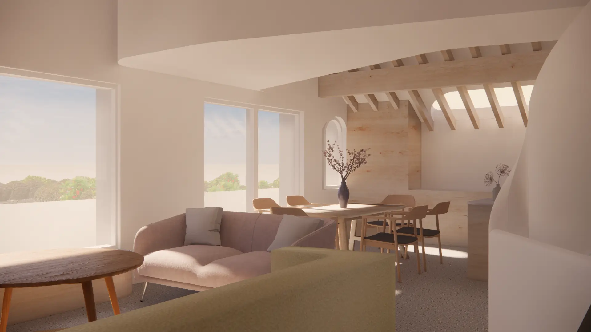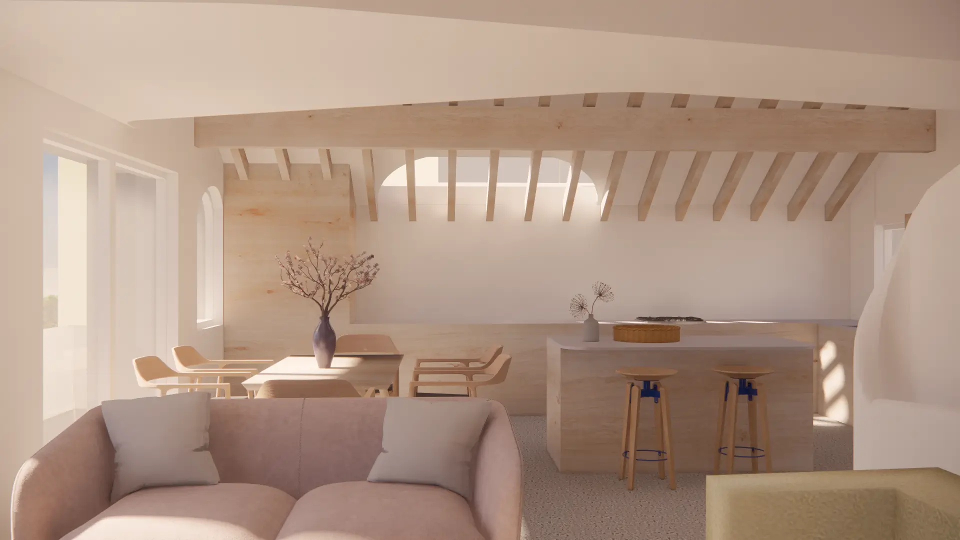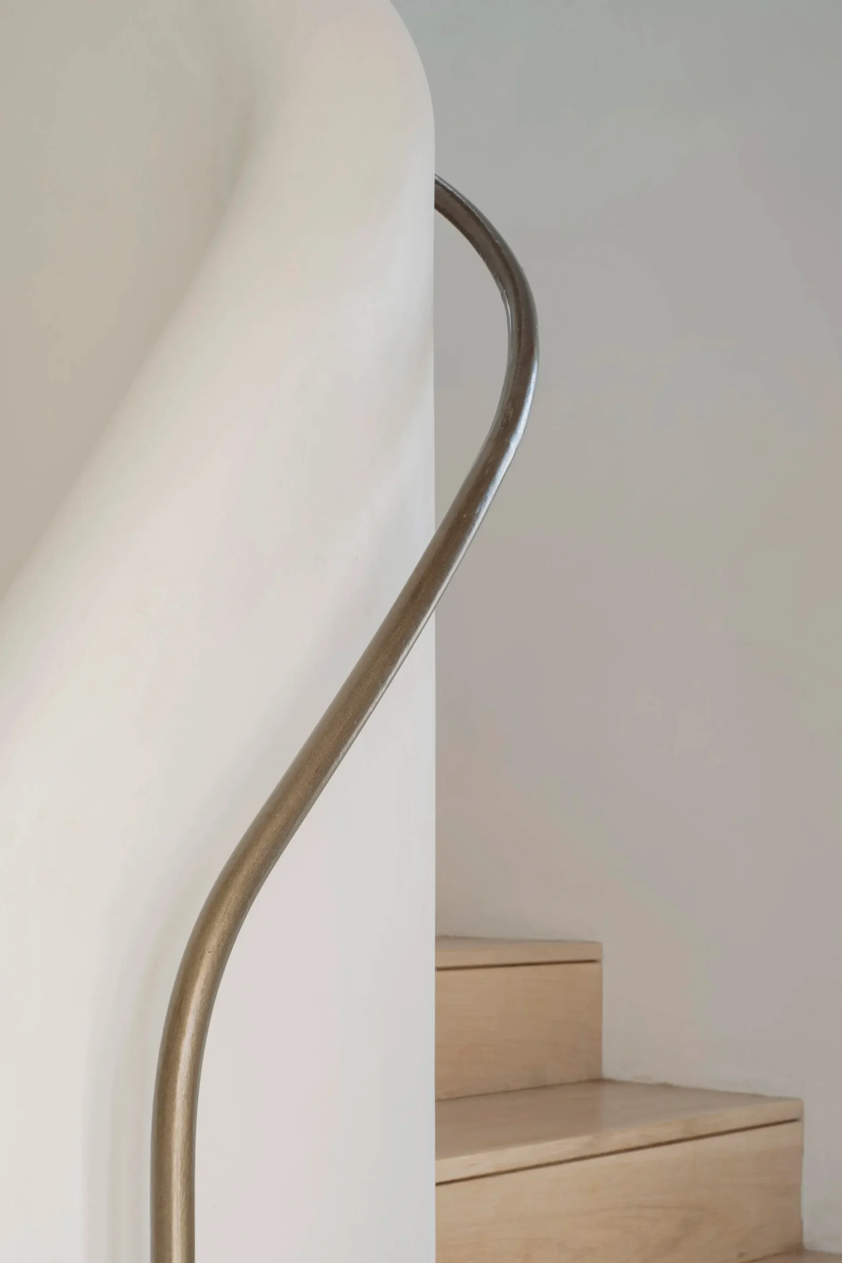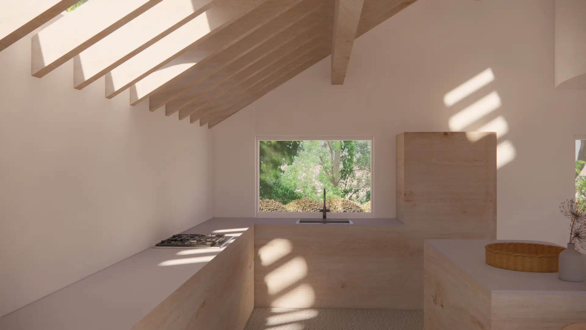 Vertical circulation is conceived as a ribbon which twirls up through the volume of the house and culminates in a small seating gallery just below the glulam apex and provides views through a circular opening towards the bay and mountains beyond.