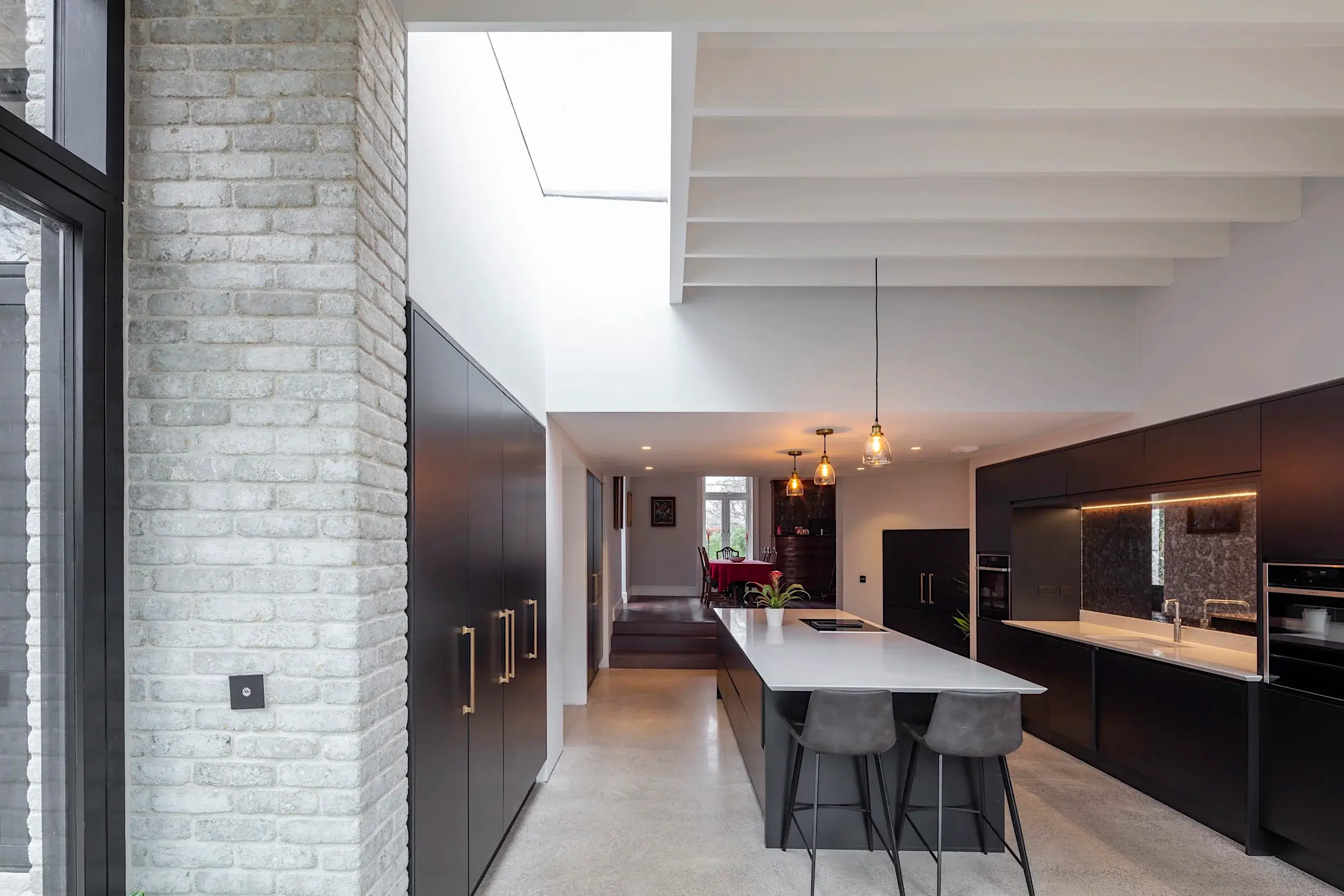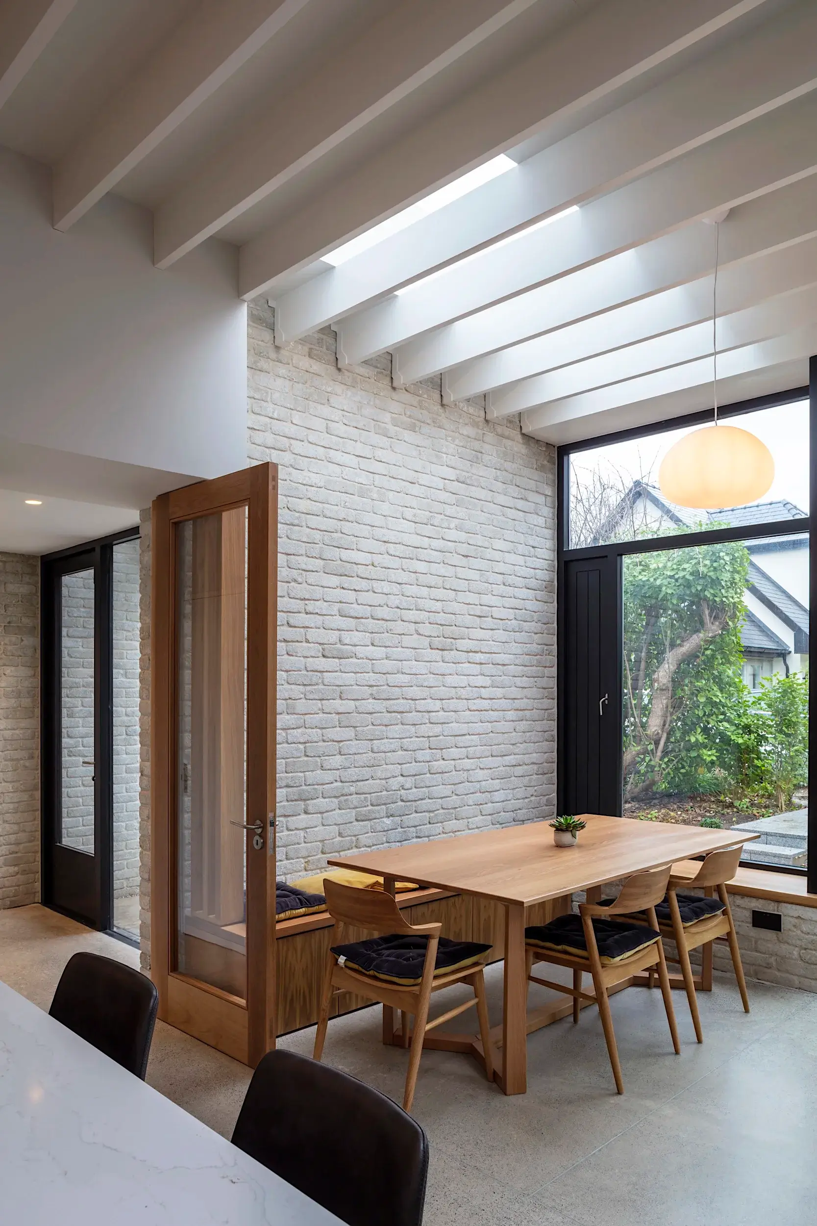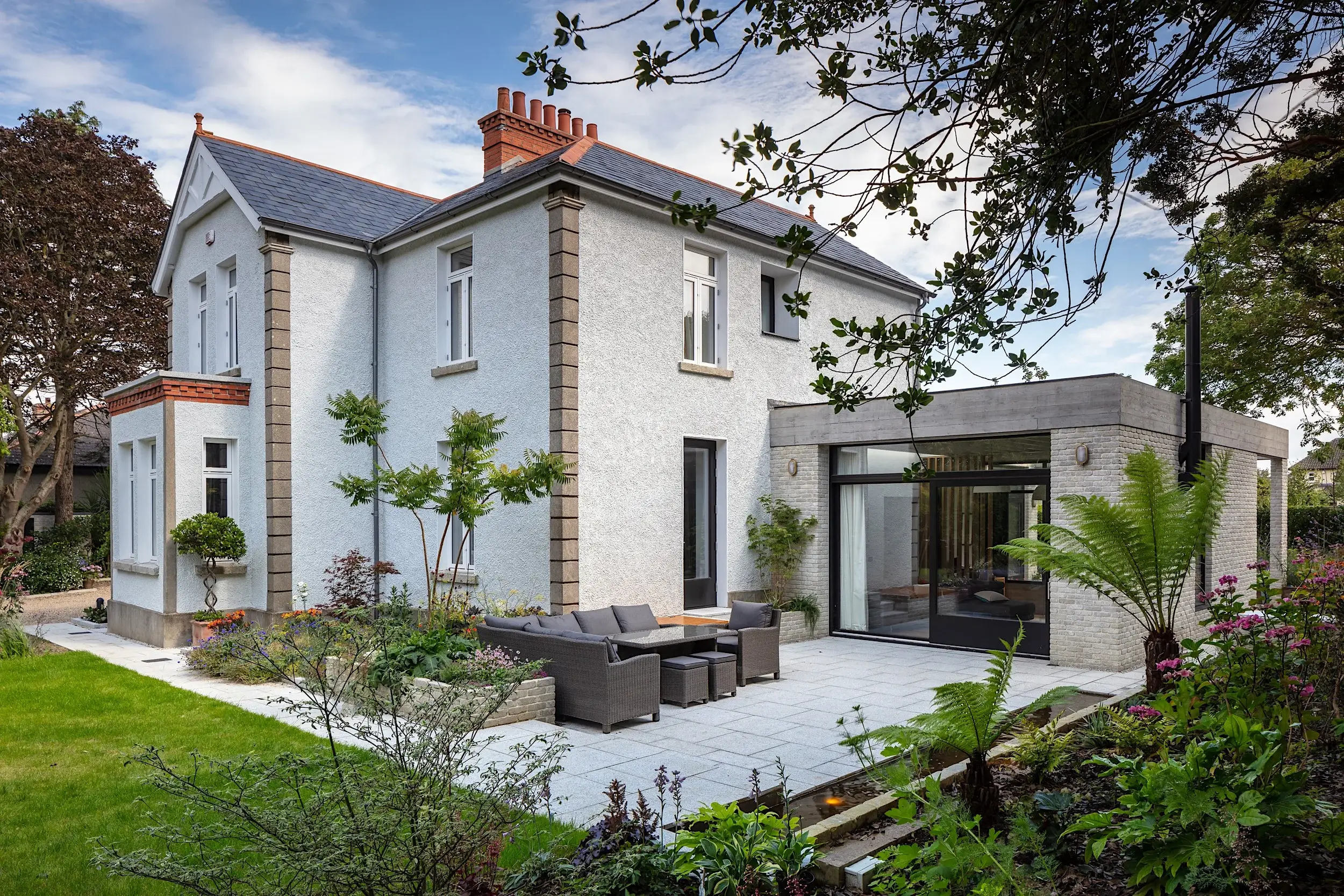 Located adjacent to Malahide Village, the original house, dating from 1912 is set among mature private gardens and framed by large trees. The project involved refurbishing and re-organising the original fabric, supplementing it with additional spaces and connecting the internal and external space providing a contemporary home for a family of 6.
