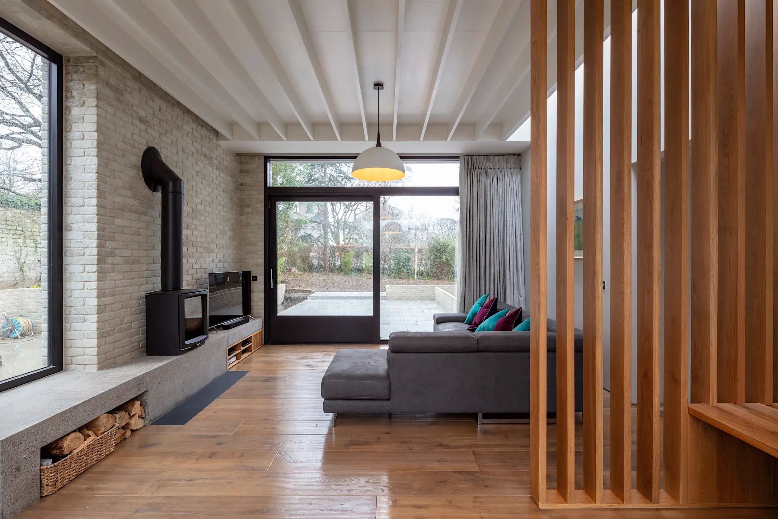 Aligning with the spine wall of the original house, two concrete ring-beams at differing levels emerge from the rear elevation, folding away from each other to frame two distinct areas – a two-storey element housing ancillary accommodation with a timber-clad bedroom over, and a single-storey element housing the new family spaces & functions – cooking, dining & living.