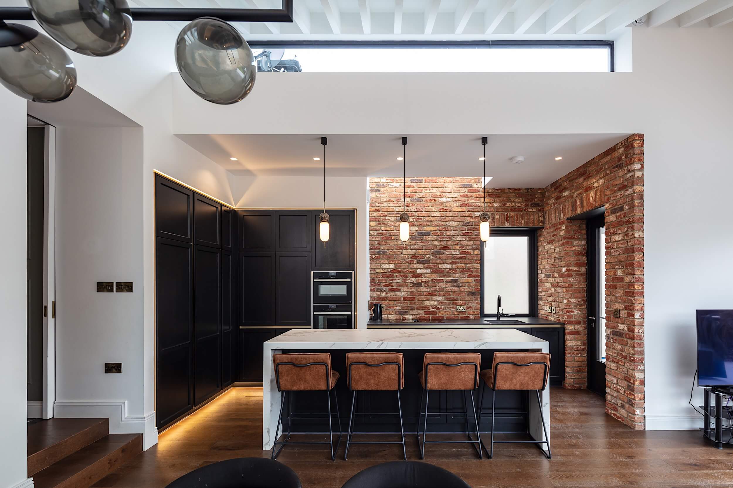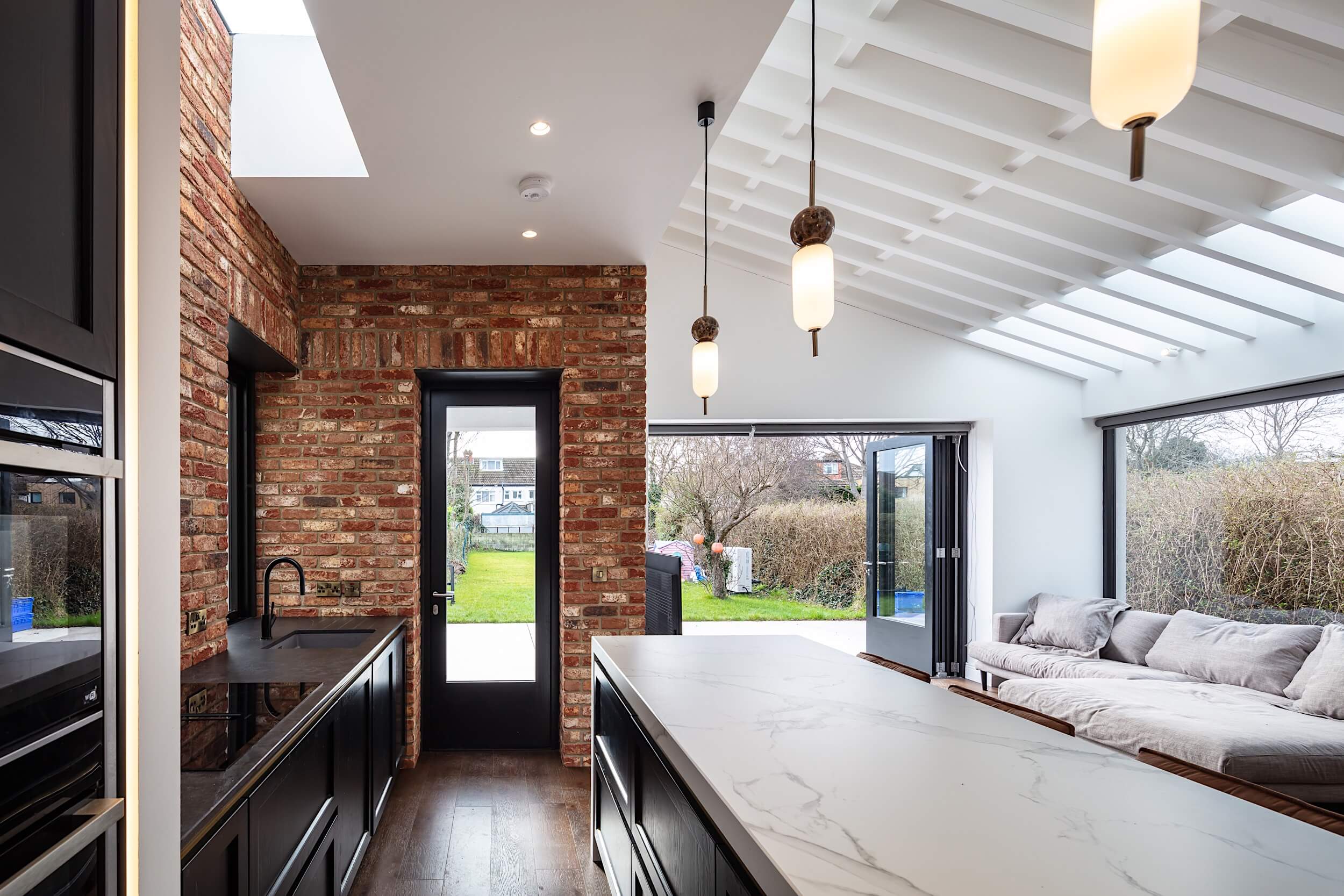The project involved a comprehensive refurbishment, re-organisation and extension of an existing semi-detached dwelling to create a modern family home. Retaining side-access to the rear garden while taking full advantage of the space above suggested the form of the side extension, while a sense of space and light to the extension to the rear, housing the kitchen, living and dining areas is created by stepping down the floor level towards the garden and forming a mono-pitch ceiling above with exposed timber and brick used to create warmth and scale.