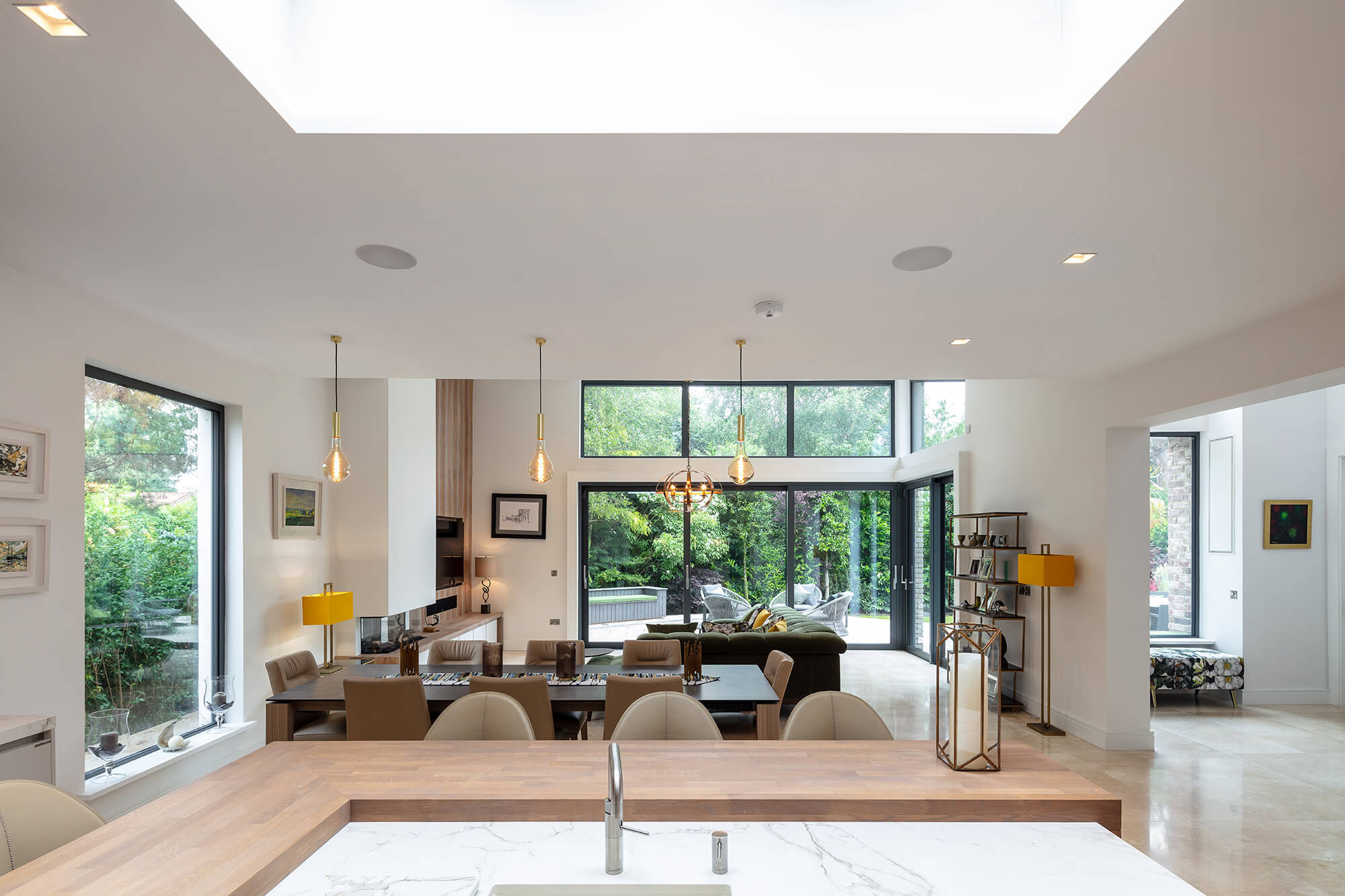Yew Lodge is a new house on a leafy lane in Clontarf by Brennan Furlong Architects. Completed as a timber-framed, A-rated home, the project was featured on RTÉ’s Home of the Year in 2022. Tucked just off Seafield Road, the house is approached along Yew Lane, where its larch-clad first-floor volume announces the building within its mature, tree-lined setting. From inside, the upper level frames views through the trees towards the spire of nearby St. John the Baptist Church, creating a strong connection between the new house and its established Clontarf context.